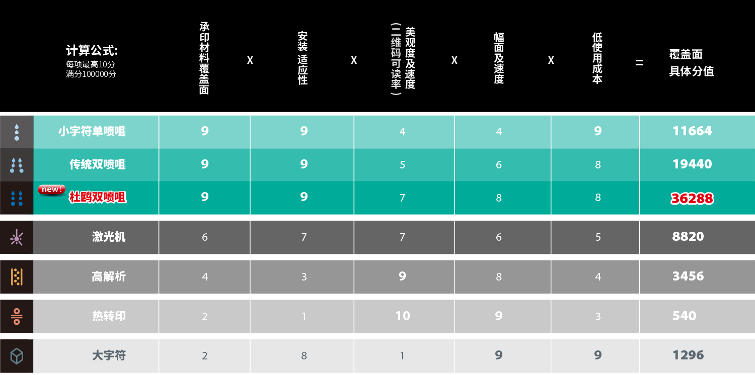 DUO(杜鸥)公司核心成员在喷码(赋码)标识领域工作超过20年,总结出小字符喷码机(CIJ)与其他标识设备对比(Laser激光、TTO热转印、PIJ/TIJ高解析、DOD大字符)优势突出,但也有一定局限性: