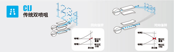 传统双喷咀:打印幅面(行数)比单喷嘴大一倍,但拼接区域不完美,二维码扫读率低